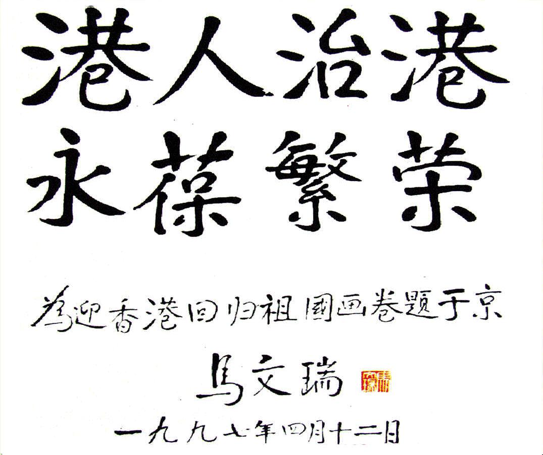 全国政协原副主席马文瑞为"迎香港回归百米书画长卷"题字留念